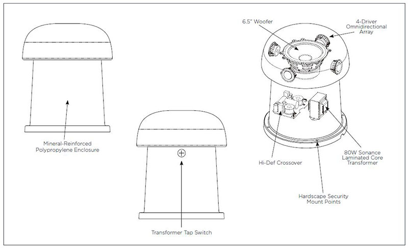 对于庭院音响系统而言,想要更好地隐匿在环境之中,其中一个最有效的方法就是尽量使用单个音箱来完成任务。这样一般情况就很难察觉音箱的存在,但是这对于音箱的声音覆盖能力提出了很高的要求。OMNI-6T从音箱设计的角度而言,属于全方向发声的户外音箱,拥有360度水平与160度垂直声音扩散角度,足以满足面积不大的小庭院的音乐播放需求。那么,从音箱内部结构上,OMNI-6T是如何实现如此广阔的声音覆盖范围的呢?OMNI-6T通过其箱体内部的4个指向不同方向的1.25英寸的宽频中高音单元,组成全方向声音辐射的单元阵列,加上一个向上发声的6.5英寸低音单元,以实现60Hz–20kHz(-3dB)的宽阔频响高保真的声音输出。这正是OMNI-6T作为全方向户外音箱的技术秘密核心所在。可能会有朋友有疑问,如果我家的庭院是相对较大,单个OMNI-6T无法满足的情况,还有什么办法吗?当然是有办法啦,根据Sonance的官方数据,单个OMNI-6T的理想声音覆盖区域大概是3-4米,如果超过这个范围,可以在选择安装两个或多个OMNI-6T,从而在较大的空间中也能达到无缝的声音覆盖连接,充分再现Sonance的“Designed to Disappear”的理念。