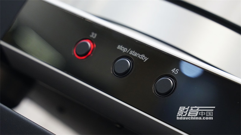 前面板中央有三个操作按键,分别是33转模式、待机模式和45转模式,输出方面提供RCA输出,同时还提供地线接口