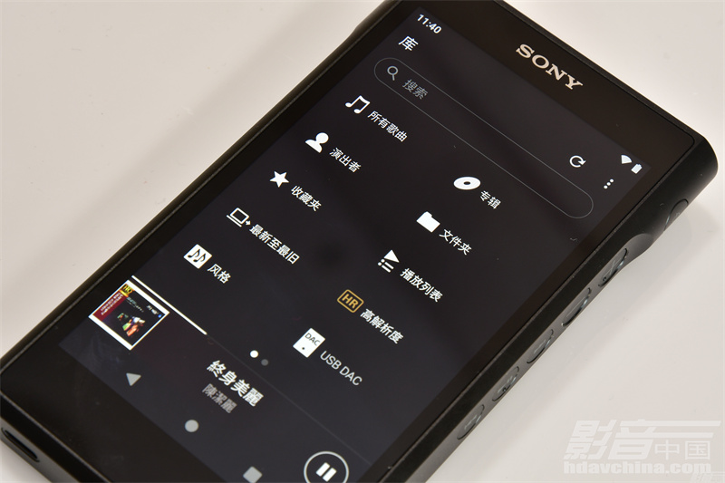 显示界面的规划,相当清晰,依次是专辑(封套、曲名、艺术家和播放/暂停等)、应用程序和预设菜单。预设菜单中最重要的是两个按键:用于显示专辑、艺术家、文件夹等的曲库(黄色Walkman标志)和音效(白底均衡器图案)。