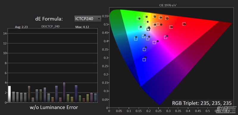 在HDR ColorChecker色准测试之中,平均误差值DeltaE ICTCP240为2.23,略高于BT.2020(宽)色彩配置模式
