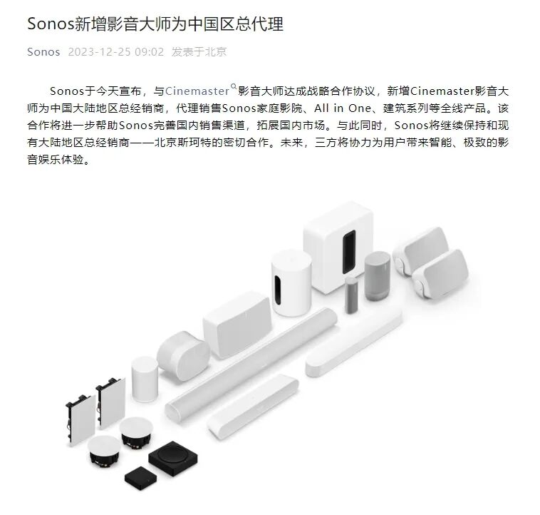 Cinemaster影音大师宣布:即日起正式成为世界知名家庭智能无线音响制造商Sonos的中国总代理。