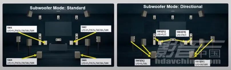 左为标准的低音管理模式下的低频信号分配,右图为定向低音管理模式下的低频信号分频