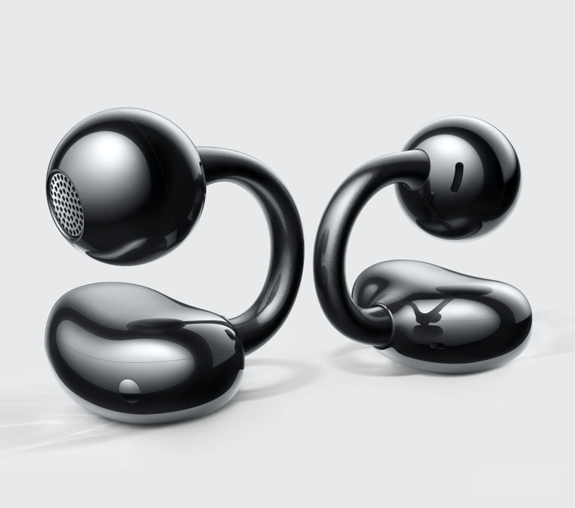 耳机造型非常别致,采取耳夹式设计,包括了聆听球、舒适逗和用于两者衔接的C形桥组成,其构成曲线锯成是基于10000+人耳数据优化得出的。聆听球(驱动单元)佩戴时位于耳廓内侧,发声孔正对耳道,舒适豆的曲面造型,在佩戴时与耳廓贴合,起到固定作用。