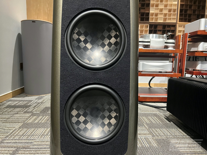 中音单元和低音单元均采用碳纤维三明治结构设计,而两个中音单元分配点有所不同,上方的中音单元负责衔接高音单元,而下方的中音单元将分配点设置在500Hz。低音单元内部具有3英寸直径的磁铁驱动系统提供了充足的运动空间与散热性。通过照片可以看到前障板似乎有些“脏”,事实是罗克在单元周围加入了类似于羊毛毡的声学材料。