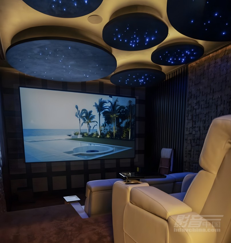 业主的特殊需求为项目增添了创意与复杂性。例如泳池、水疗室和影院的星空光纤顶棚,灵感源自其新购跑车顶篷设计。这一后期加入的元素需要室内设计团队与建筑师精密配合。影院天花板设计尤为独特:圆形元素代表每位家庭成员,星座图案则由光纤排布构成。