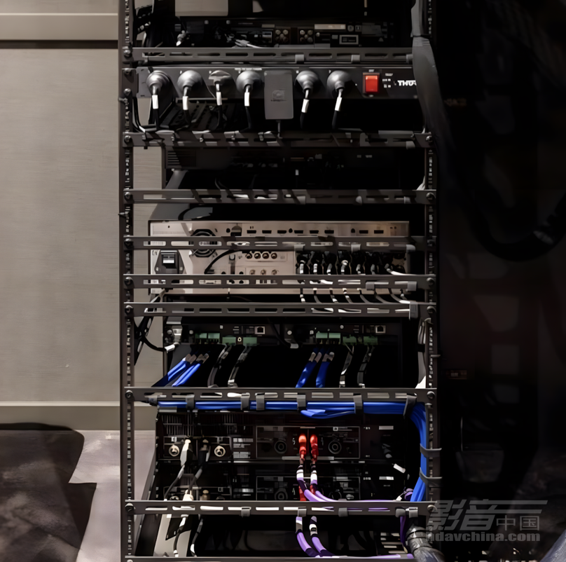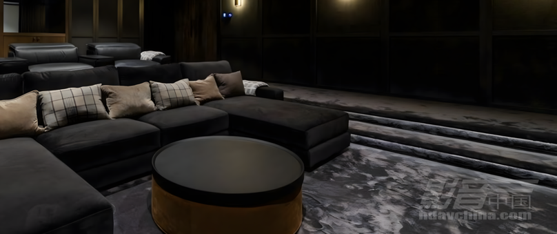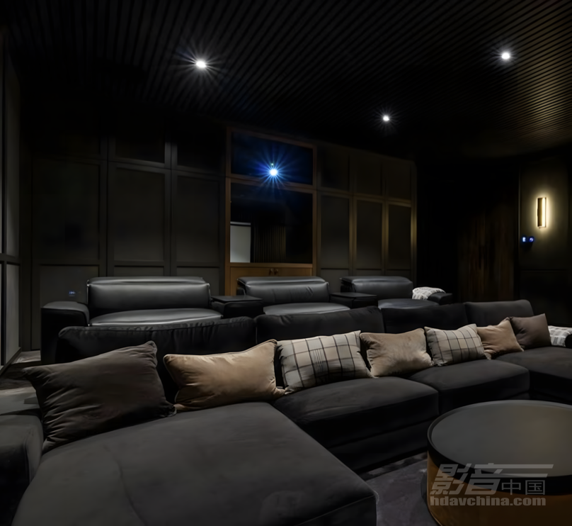 内部声学调校结合吸声与三维扩散策略:采用NRC性能达0.95的吸声板配合战略性空气层,搭配扩散面板控制回声与混响,实现混响时间约300ms的平衡声场。客户特别重视影院后方的带镜面酒吧区域。集成商通过定制木作工艺减少振动干扰,每个隔断均精密分区以精准布置超低音扬声器,提升全场低频表现。为抑制超低音振动对精密设备及器皿的影响,后墙扬声器采用吸声垫安装,并通过橡胶隔振支架连接木结构以阻尼振动。
