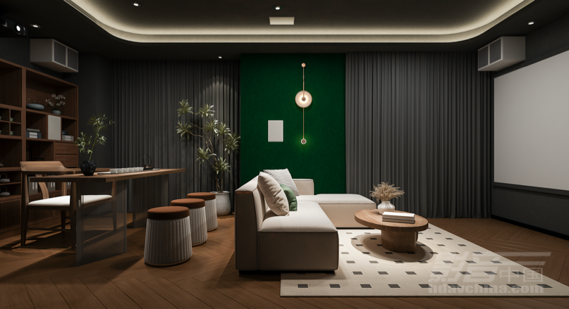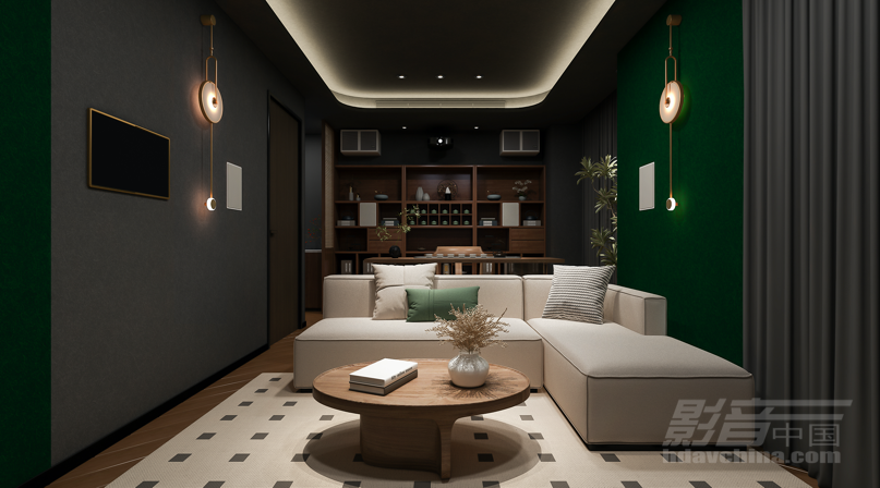 空间主色调选用深灰与墨绿,沉稳而富有质感,同时有利于光线吸收,提升视觉专注度。